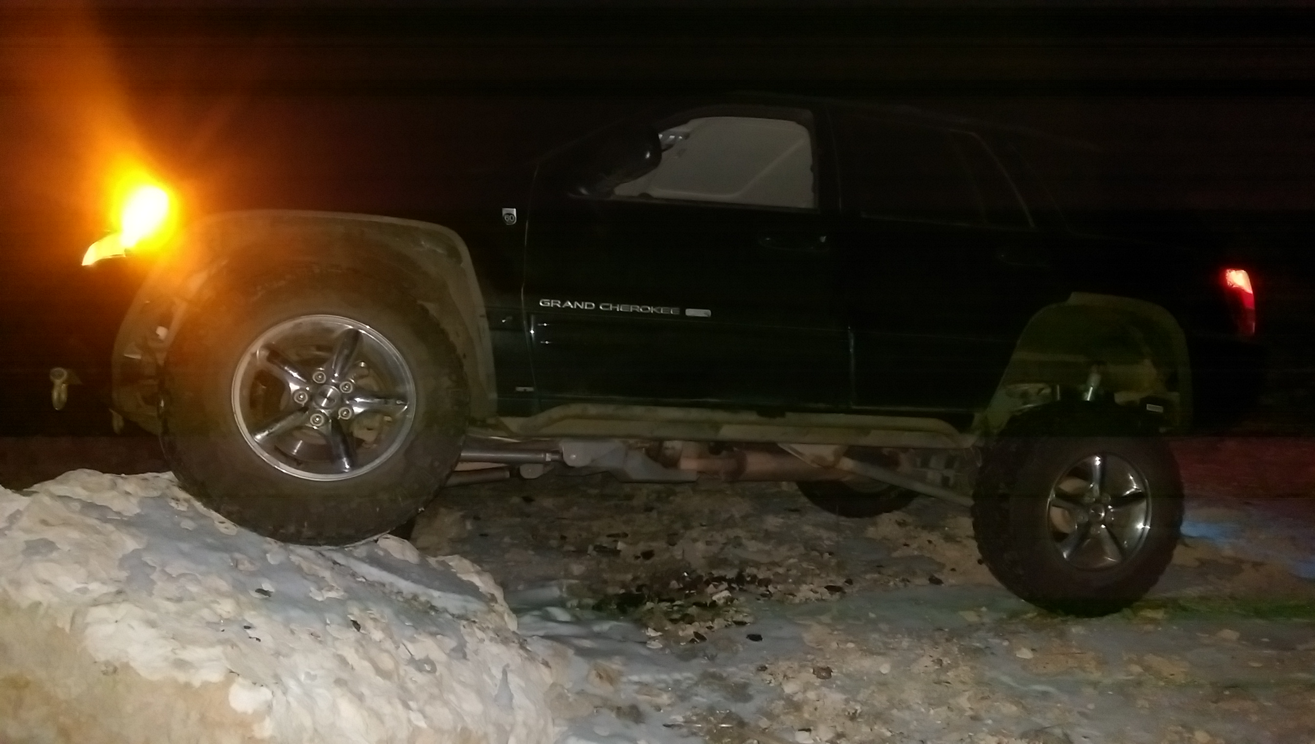 I bought the Rough Country kit before I really knew too much about what was available for the WJ. I was aware of the Clayton kit, but with my budget, it was simply out of the question. But it did help to set my priorities for the kit. I wanted long arms and I wanted to get rid of the belly-shovel-of-a-crossmember that comes stock on these Jeeps. The Rough Country 4″ long arm lift kit fit the bill and fit my budget. The kit design consists of two “halves”. Up front is a complete replacement of the factory four link design with a dual radius arm configuration. The mounting location for the body-side lower control arm is moved back about 8 inches (in line with the new transmission crossmember) to accommodate the long arm. The rear lower body mount is moved about 10 inches forward for the same reason. The wishbone/3-link/boomerang/rear upper control arm is replaced by a stronger tube steel version, with a flex joint to replace the ball joint (a MUCH needed improvement). It also came with a complete replacement for the transmission crossmember (and a transfer case skid plate too) to tuck things up out of the way, which is awesome because the stock crossmember was a sore spot on the otherwise phenomenal chassis design of the WJ (yea, I’m biased. so?). I had them delete the shocks from the order, as I had already decided to run Bilsteins on it. That decision saved me $200 off the lift, which I applied toward the shocks. Here’s a writeup I did on Reddit way back when my writing sounded pretentious as fuck. I have some very different ideas and a whole lot more knowledge now than I did when I wrote that, but I had different goals for the Jeep back then too. It’ll at least give you a good detail of the kit itself though.