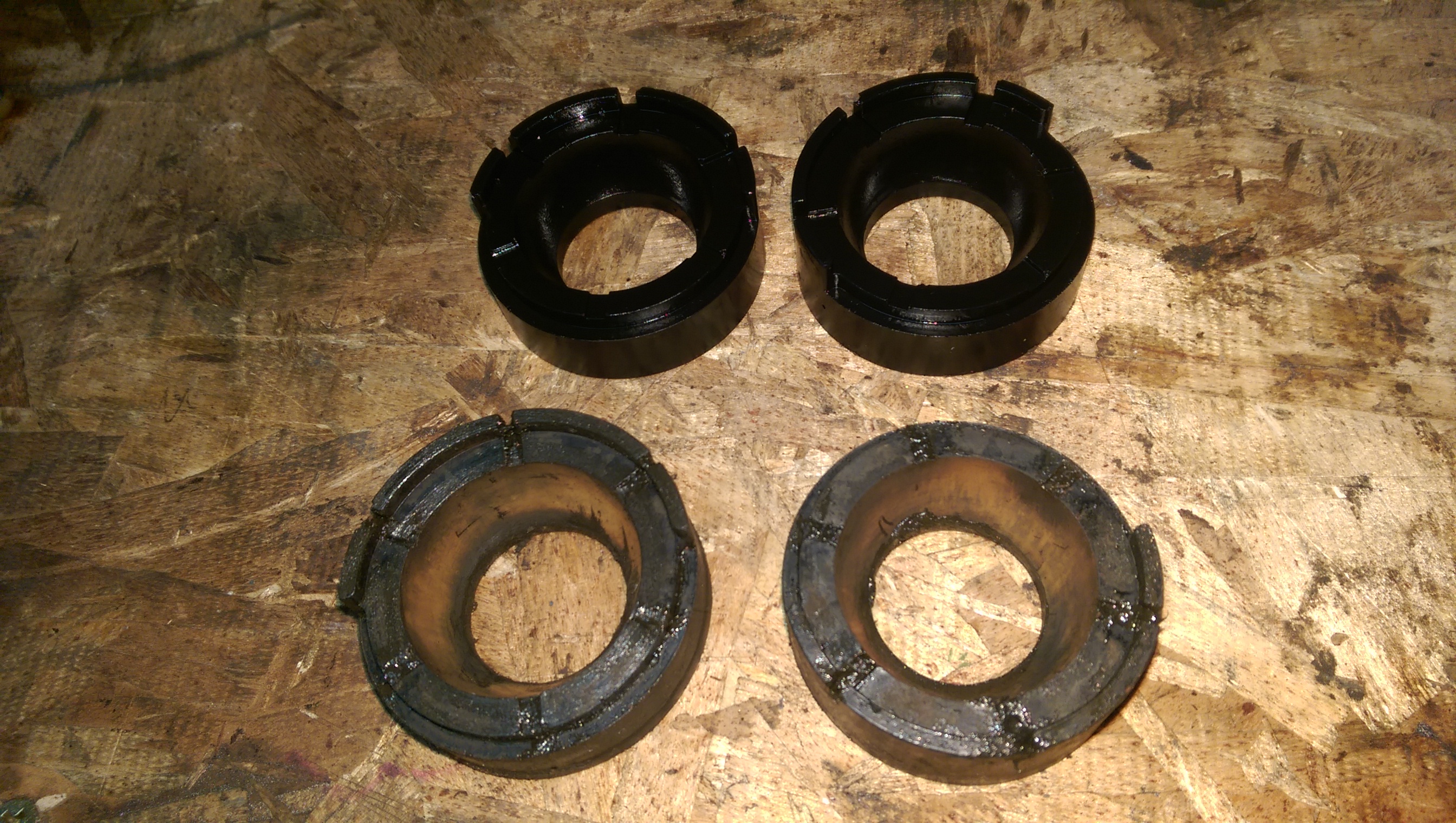 Here are the flex joint inserts from the front lowers, where they mount to the body. In my opinion, these joints get the most abuse, since they are the ones soaking up all the impacts from cement joints, potholes, rocks, roots, etc, etc, ad nauseum. The top pic has the old urethane inserts below the new replacements. As you can see, there is hardly any wear on them, even after two years of serious use.