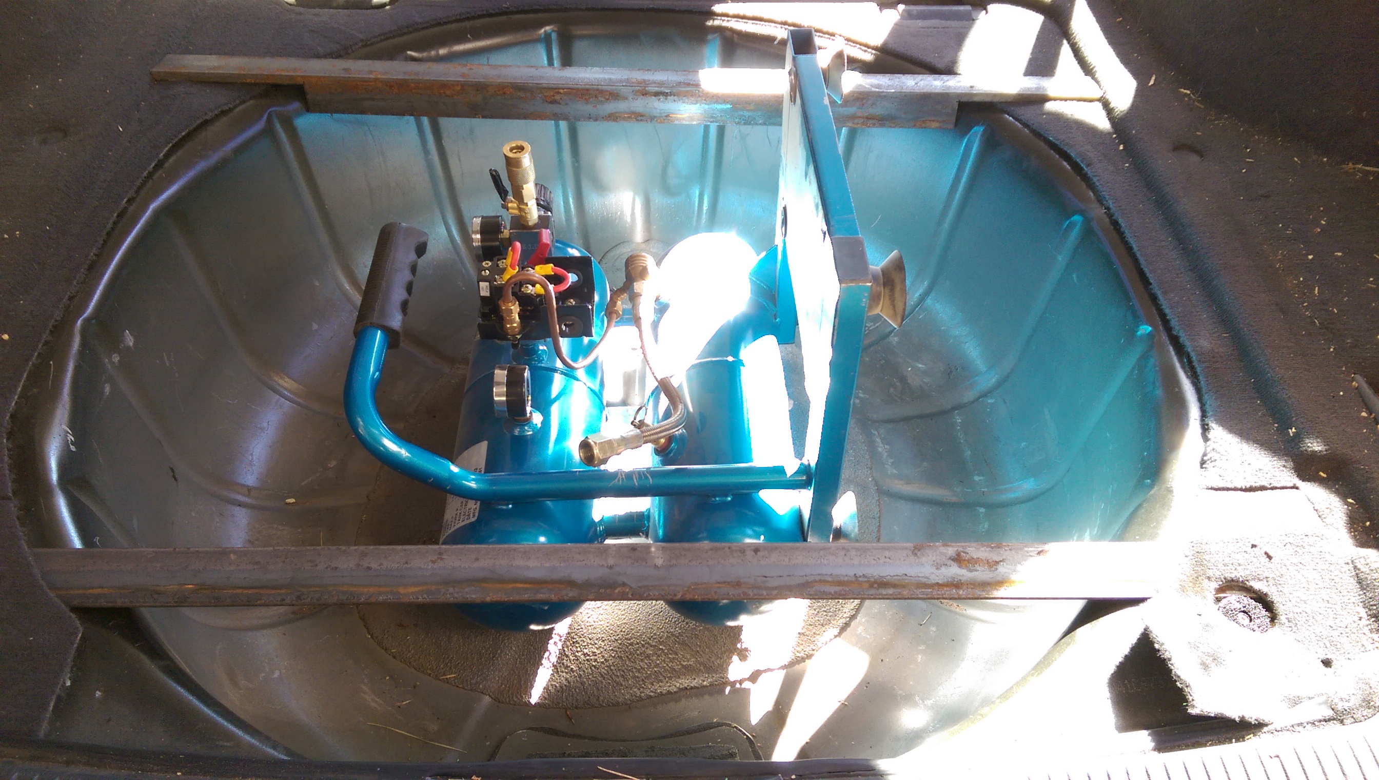 I decided to make a quick bracket to mount in the tire space until I do the tank tuck (more on that later). The quick bracket turned into a full tilt on board air system that will be able to run air tools, air actuated differential lockers, and of course quickly air up the tires on several vehicles.
