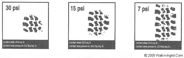 To get the tire pressure thing out of the way, when you let some air out of your tires (typically 30-50% for most of us), more of the tire makes contact with the ground. With lower and lower pressure, the larger this “contact patch” gets, and the more traction the tire is able to maintain. Here’s an illustration to illustrate my point: