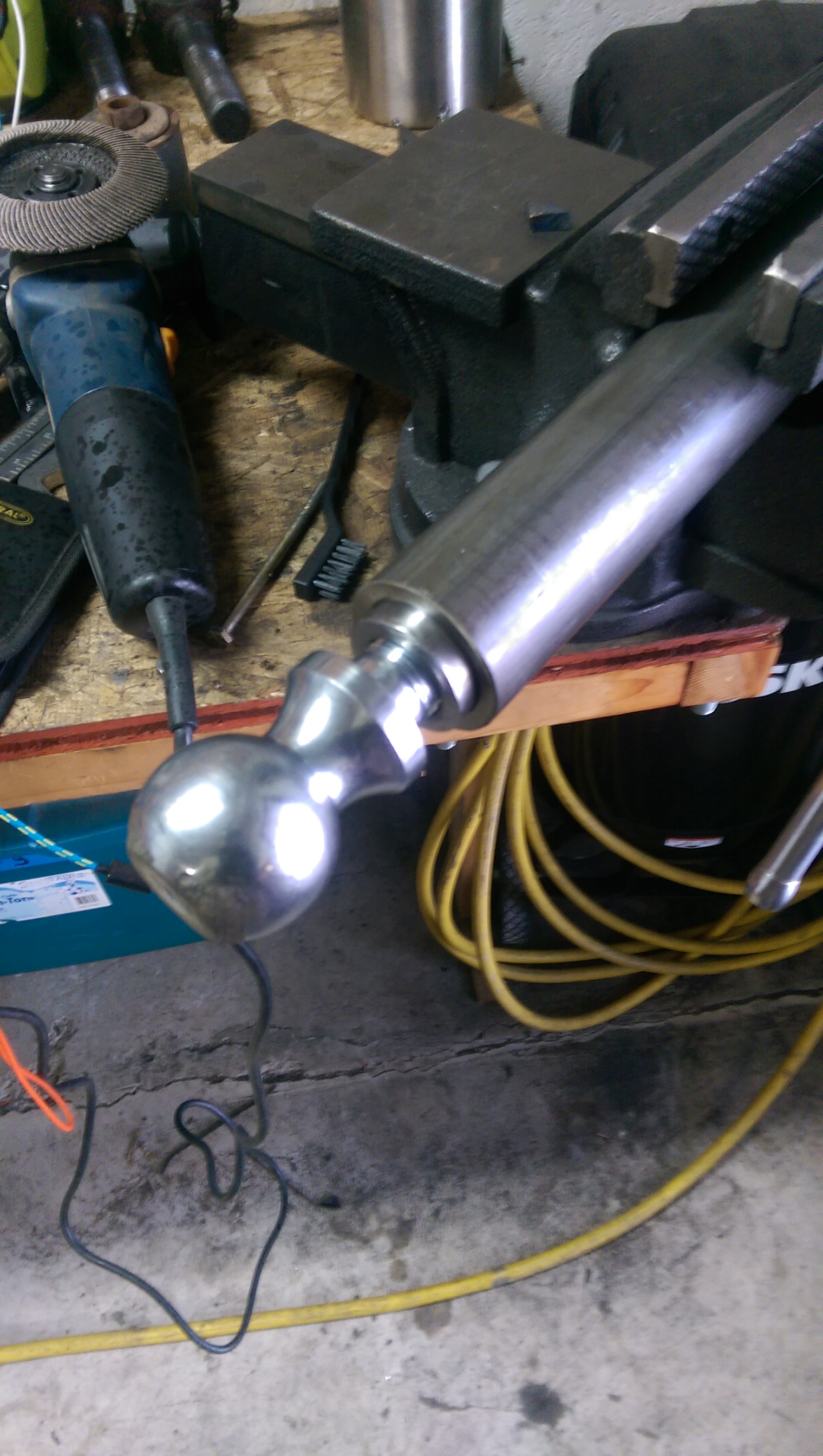 Here, I used a 2″ tow hitch ball (which, perfectly, had 1″-14 threads) as an anvil to hammer the inserts into the DOM tubing. Once there was approximately 1/4″ of insert left out (as above) I welded it all up. Then paint, and install the new Johnny Joints.