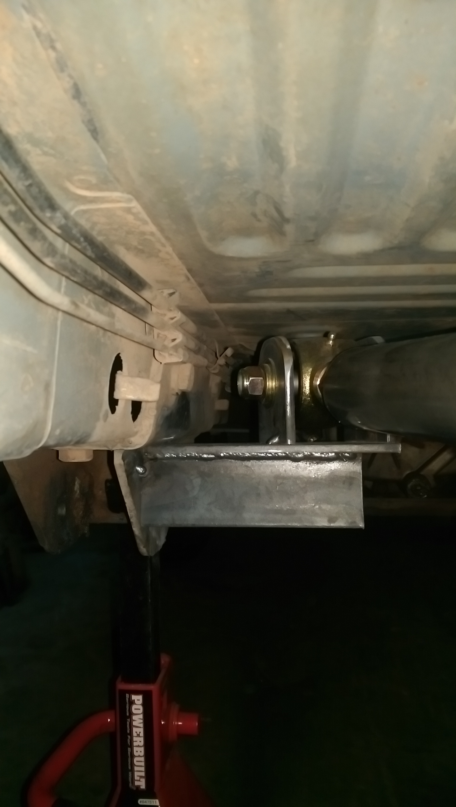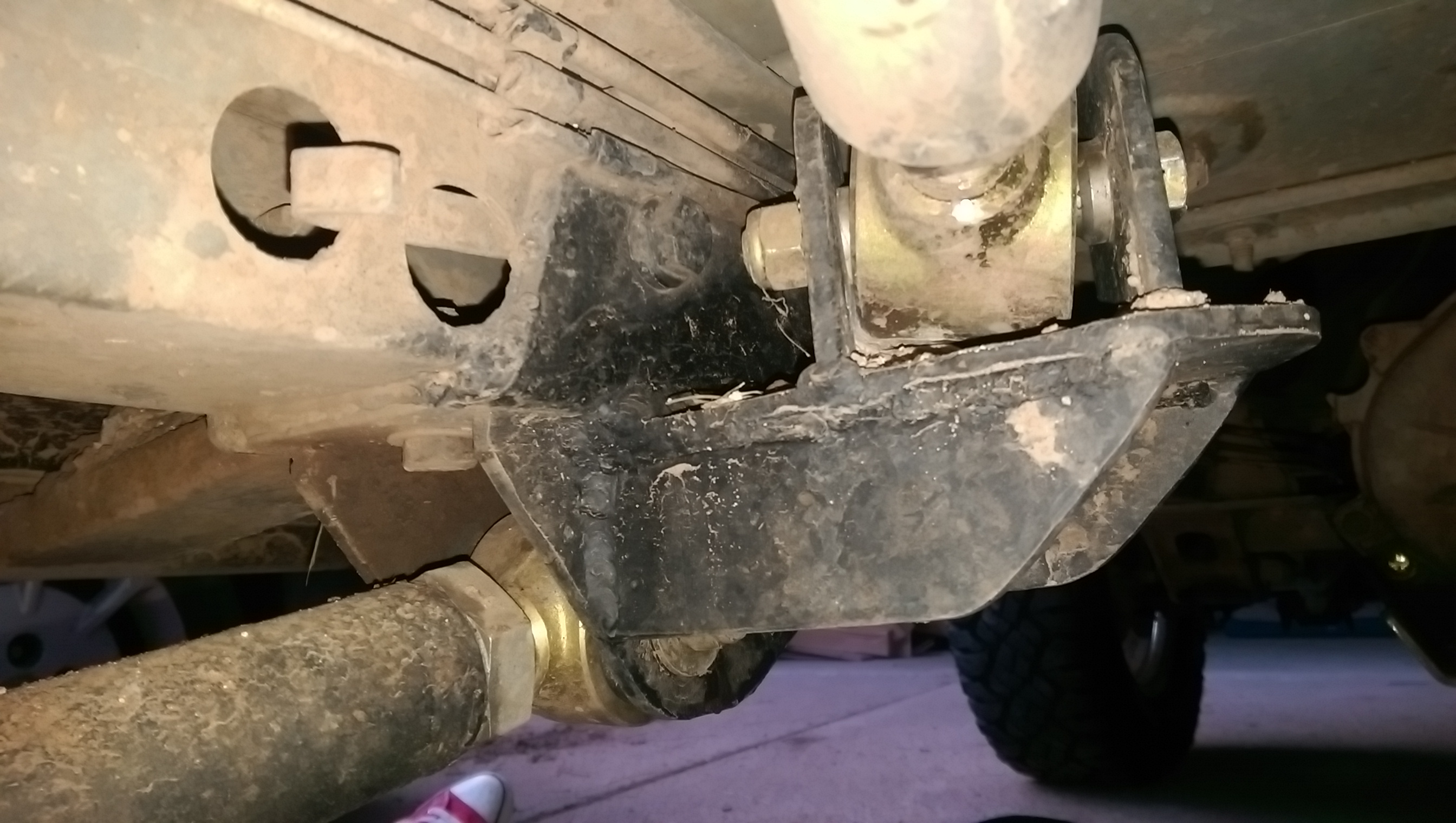 I ground the paint off of the brackets that are currently installed on my Jeep that keep the rear lower links in place. I just tacked some plate on it, and then cut and welded in some gussets. Then I pulled it apart, took it back to the bench and finished out the weld.