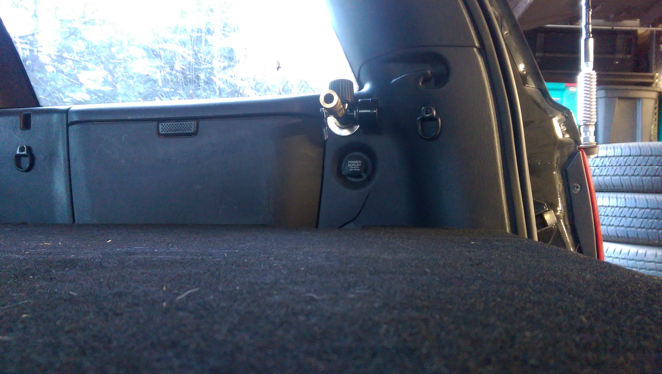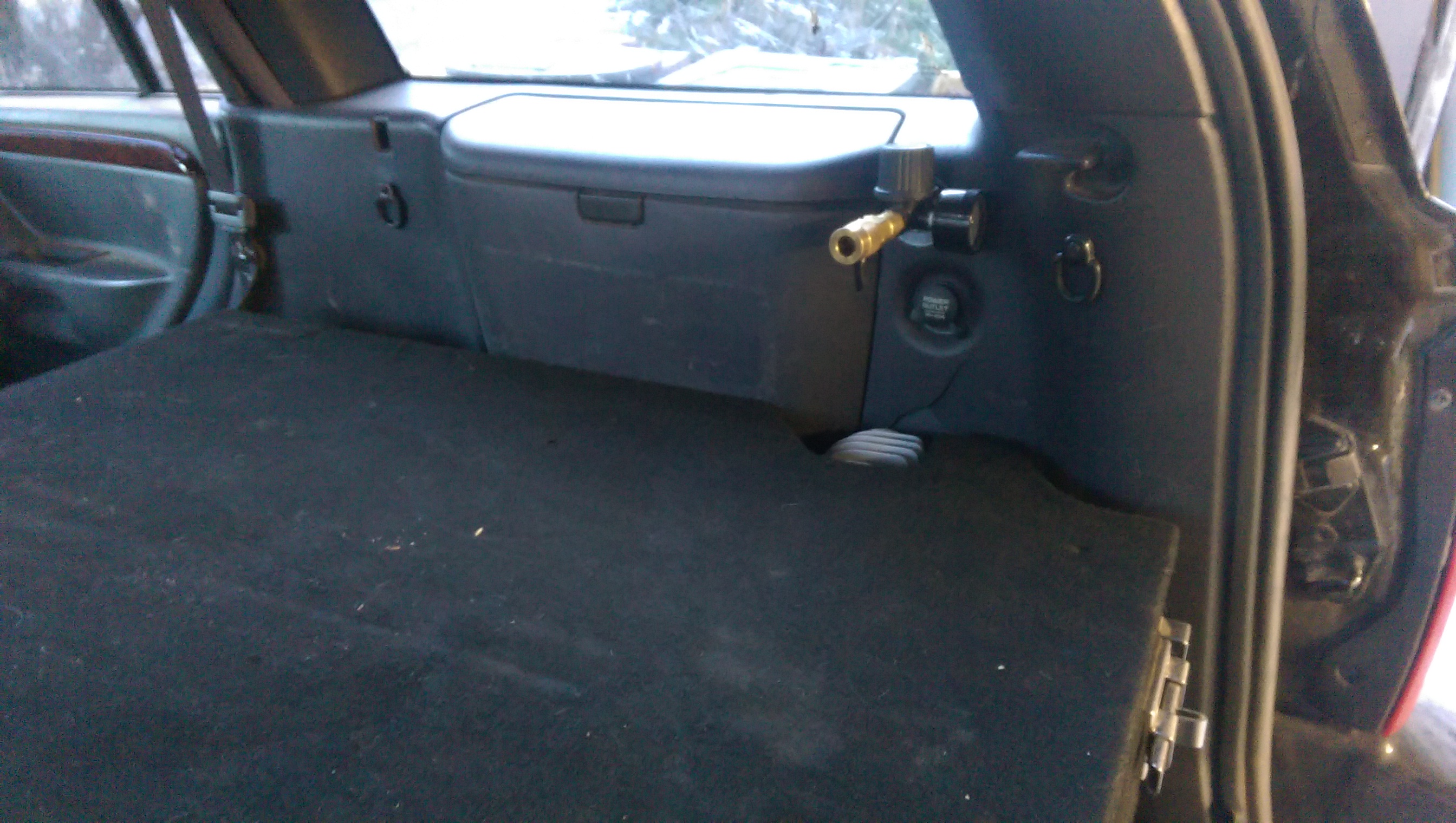 As it turned out, everything went very smoothly back together. I measured the area I needed to cut out to go around the head, cut it (with a sawzall in jigsaw fashion. I’d have been in some shit if I’d have got caught… Also, danger, blah, blah, blah), trimmed the carpet to fit, and violin! It’s done! The compressor head isn’t even exposed to any damage. Heat has been a thought, but so far it’s stayed plenty cool, even when running constantly. There is a wind tunnel from the back seat to the back of the jeep though, so it’s not that surprising.